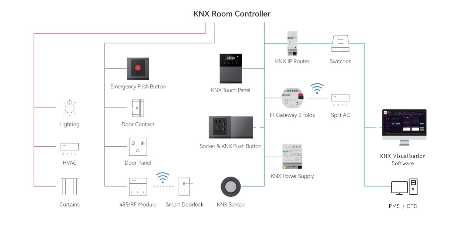 CM Otomasyon olarak KNX kontrol üniteleri ile otel odalarına özel çözümler sunmaktayız. Aydınlatma, iklimlendirme ve perde kontrolleri ile hem konuklarınıza daha konforlu bir konaklama deneyimi sunarken hem de enerji tüketiminizi azaltarak tasarruf etmeniz sağlanır. Karşılama, Oda Dolu/Boş, Gece/Gündüz gibi senaryolar ile kurumsal kimliğinizi de güçlendirebilirsiniz.
